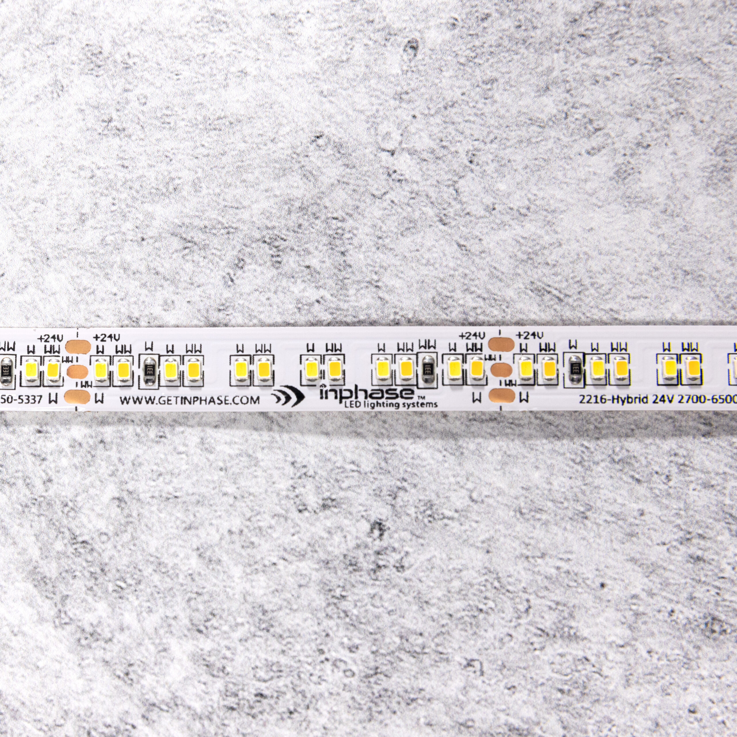 The Hybrid CCT SMD2216 LED Tape is a high-density tunable white lighting solution designed for installations requiring smooth, continuous light output with precise color temperature control. Featuring 240 tightly spaced 2216 LEDs per meter, this tape offers more than double the LED density of traditional 2835 models—resulting in brighter, more even illumination with minimal spotting. Tunable from 2700K to 6500K and operating at 24V DC, this 10mm-wide tape delivers 19.2 watts per meter and is fully DMX controllable for dynamic lighting environments. With a high CRI of 90+, constant voltage design, and an IP20 rating, the SMD2216 tape is ideal for architectural, display, and scenic applications requiring professional-grade white light performance. Rated for 50,000 hours at full brightness.